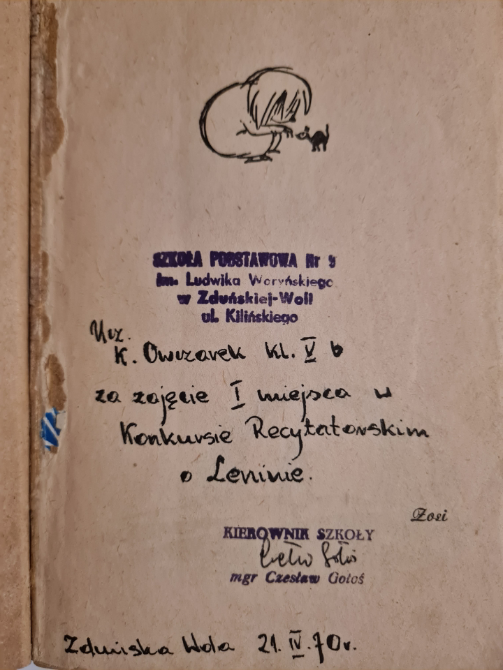 Nagroda za zajęcie pierwszego miejsca w konkursie recytatorskim o Leninie